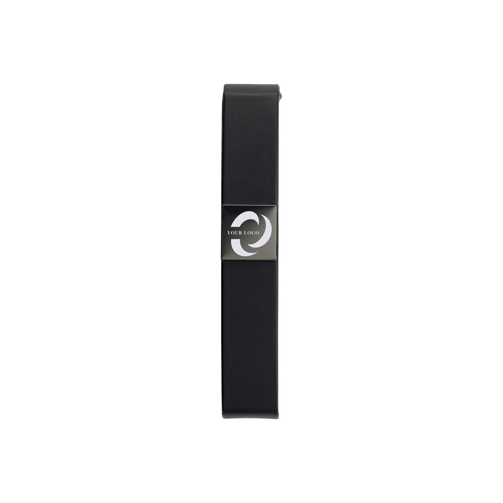Luxe zwarte PU pen cassette, geschikt voor één pen, met een zwart glanzende metalen plaatje voor bedrukking (formaat 2,6 x 2,6 cm), een zwart fluwelen binnenzijde en magneet sluiting.
