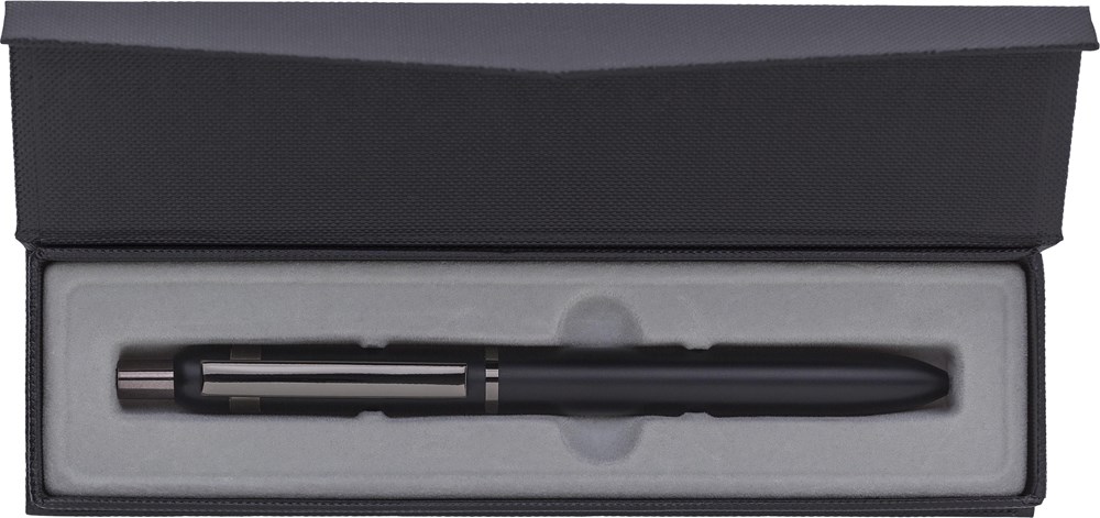 Aluminium en messing balpen. Met glanzende details op de clip, ring en drukknop. Blauwe inkt. Individueel verpakt in magnetische geschenkdoos met papieren hoes.