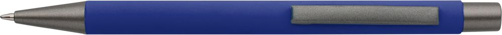 Recyclede aluminium balpen met een zachte rubberen afwerking en blauwe schrijfinkt. Ontworpen met donkergrijze accenten en een spiegelende onderlaag die zorgt voor een opvallend gegraveerd resultaat. Voorzien van een drukmechanisme en afgewerkt met een gegraveerd gerecycled logo.