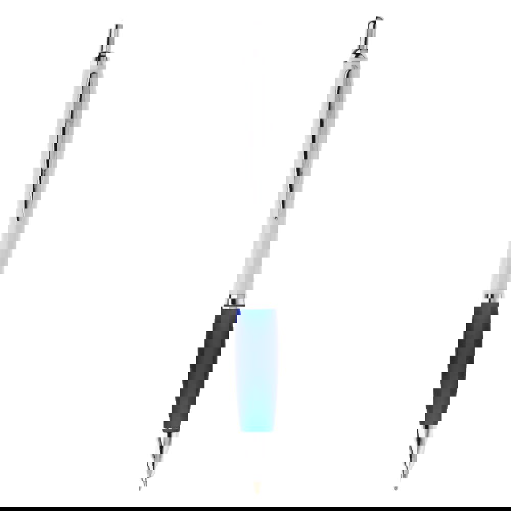 Witte balpen met metalen clip en metal look drukknop, ring en punt. De pen bevat een blauwschrijvende Jumbo vulling.
