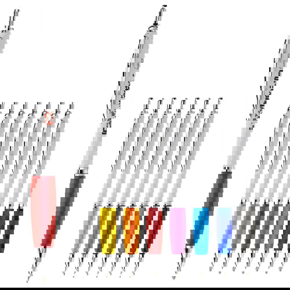Witte balpen met metalen clip en metal look drukknop, ring en punt. De pen bevat een blauwschrijvende Jumbo vulling.