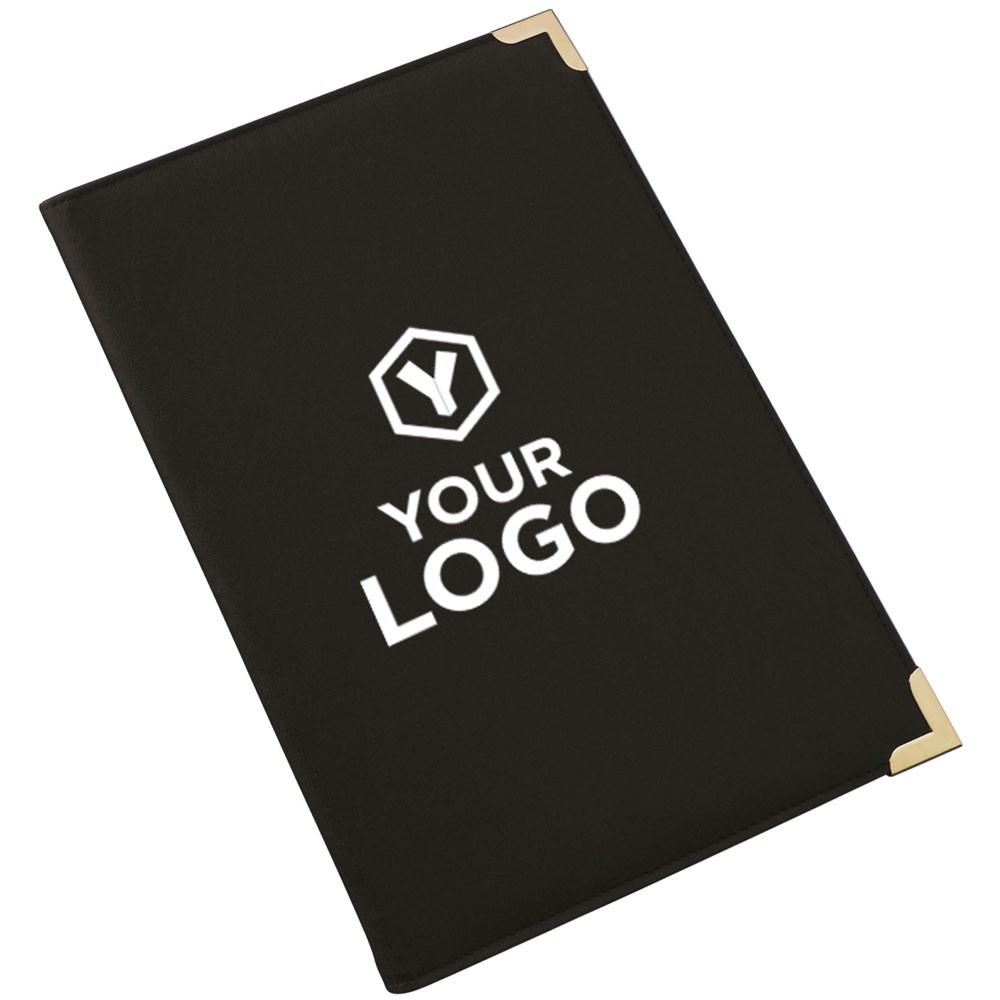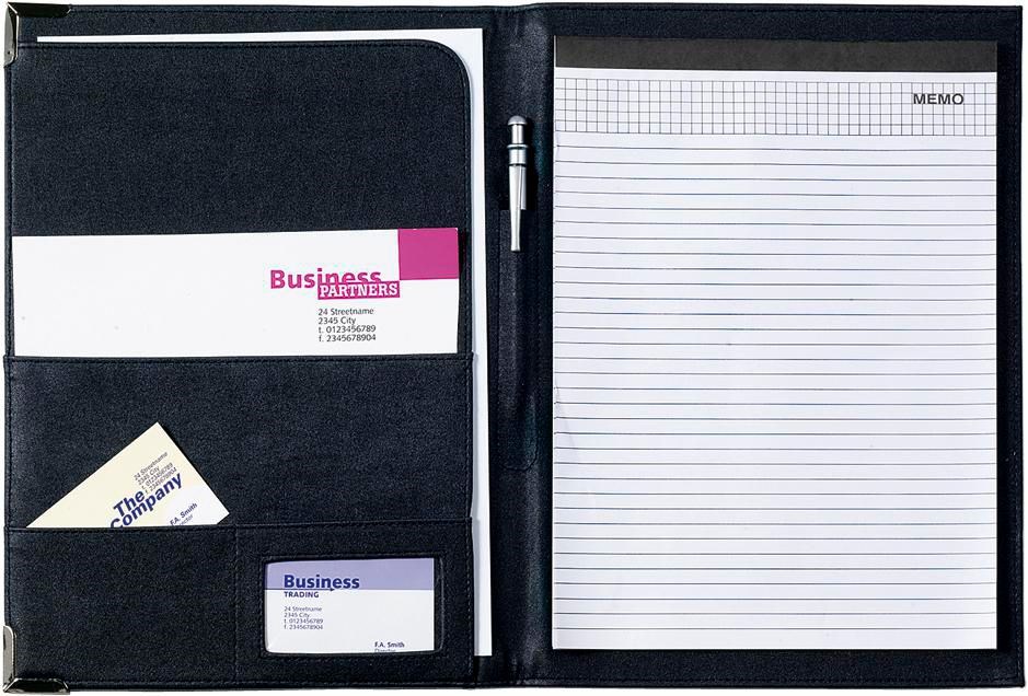 PU documentmap (A4), met metalen hoeken en diverse vakken, exclusief schrijfblok en pen. De blauwe uitvoering heeft zilverkleurige hoeken, de zwarte uitvoering goudkleurige hoeken.
