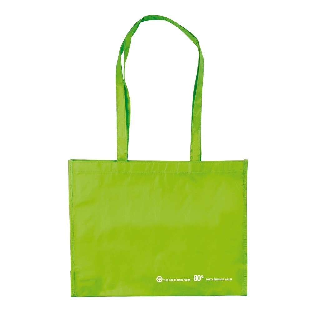 Stevige grote tas gemaakt van 80% gerecycleerd PET materiaal (plastic flessen). Groot drukoppervlak. Vanaf 3.000 stuks diverse formaten mogelijk.